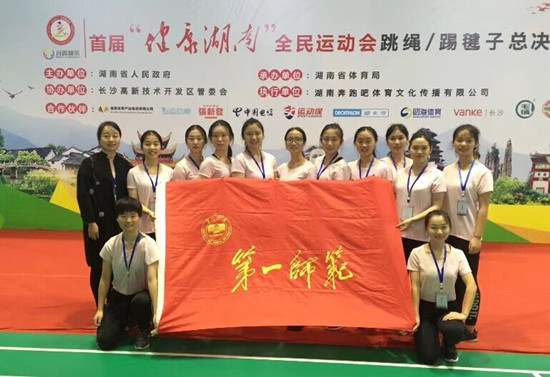 本届“健康湖南”全民运动会由湖南省人民政府主办、湖南省体育局承办,来自长沙、岳阳等9个市州和湖南师范大学、beat365平台唯一官网2所高校的11个代表队200多名运动员参加了此次赛事。beat365派出的跳绳队由体育学院党总支副书记祝娅担任领队,刘丽、雷蕾老师担任教练,来自体育学院2017级的12名学生参加了比赛。