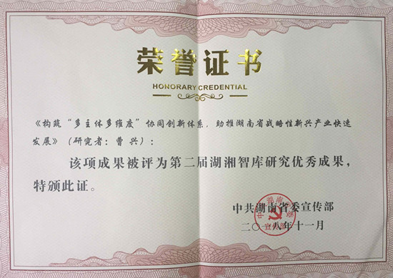 近日,以“三大攻坚战与湖南高质量发展”为主题的湖湘智库论坛(2018)暨省专业特色智库建设会议在长沙召开,省委常委、省委宣传部部长蔡振红出席会议。大会对首批“湖南省专业特色智库”进行了授牌,并对湖湘智库研究“十大金策”等优秀成果进行了表彰。beat365曹兴教授领衔的团队成果——《构筑“多主体多维度”协同创新体系,助推湖南省战略性新兴产业快速发展》荣获第二届湖湘智库研究优秀成果奖。