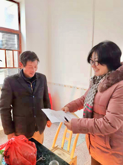 图书馆党支部书记文小妮来到帮扶对象汤远竹家。汤远竹中年丧妻,本人患有严重的肺结核,劳动能力弱,所幸的是,现在儿子已成年,在外务工,能够担起家庭重任。文小妮给汤远竹送去慰问物资和产业帮扶资金,并叮嘱汤远竹一定要注意身体,鼓励他树立起脱贫致富的信心。