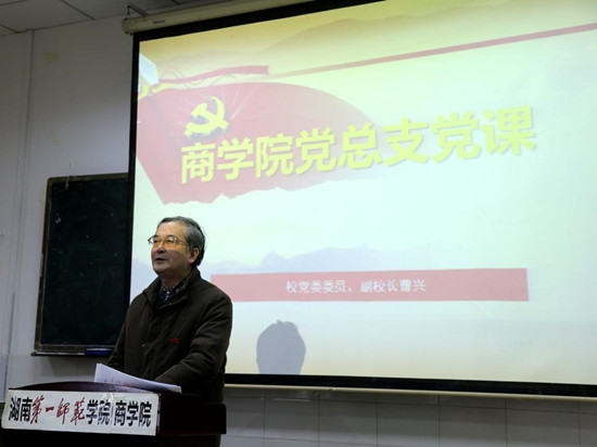 12月11日下午,副校长曹兴在玉衡楼南栋604教室为商学院教职员工上了一次鼓舞人心的党课。党课的主题为“新时代、新思想、新担当、新作为,加快推进学校‘双一流’建设”。