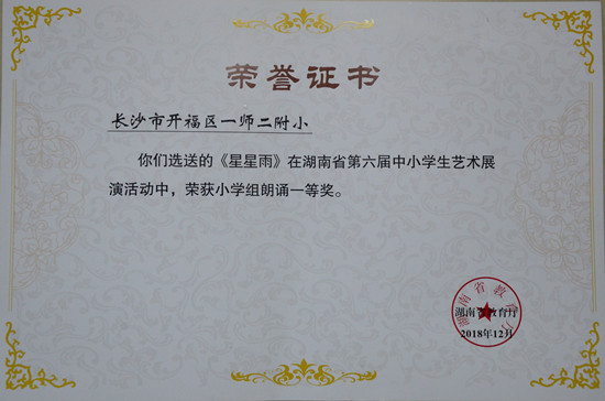 近日,湖南省教育厅下发《关于湖南省第六届中小学生艺术展演活动获奖情况的通报》。beat365二附小选送的节目《星星雨》在本届展演活动中荣获小学组朗诵一等奖第一名,并将作为湖南省唯一一个朗诵节目推送至教育部参加第六届全国中小学艺术展演。