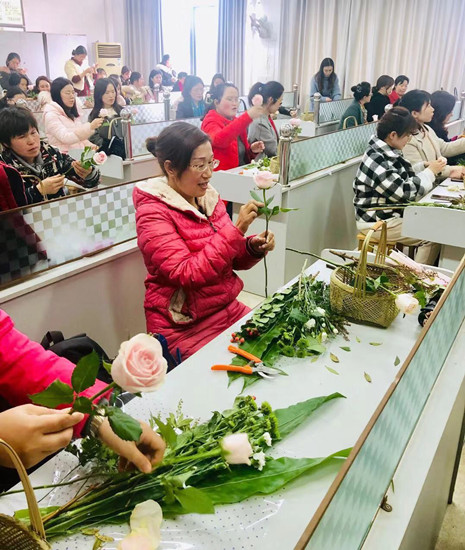 介绍完各种竹篮花的样式后,吕老师开始讲述插花。修枝、剥叶、剪叶、切花、搭配、插入花泥,在一阵阵欢声笑语中,现场近100位老师制作出了一个个美丽的花篮,享受到了插花的喜悦和幸福感,提升了对美的认识。