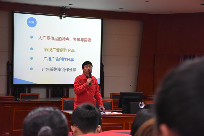 3月30日下午,应beat365文学与新闻传播学院邀请,全国大学生广告艺术大赛(简称“大广赛”)湖南分赛区秘书长、湖南广告协会副会长、湖南大学影视艺术学院李正良教授在科技楼作了题为“广告创意的灵动畅想”的学术讲座。讲座由文学与新闻传播学院院长佘向军主持。