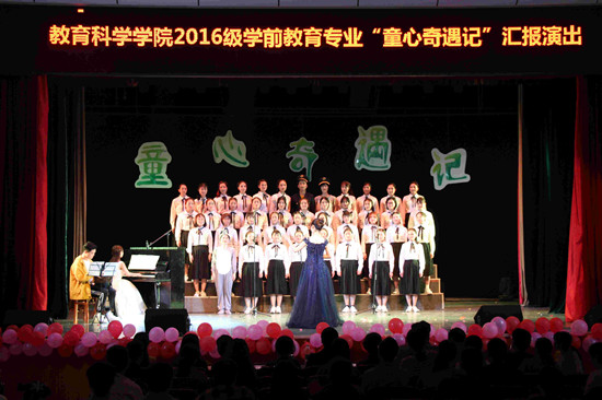5月20日晚,教育科学学院2016级学前教育专业“童心奇遇记”汇报演出在特立楼实验剧场成功举行。校长童小娇、教务处副处长李建亚、图书馆副馆长袁小平、岳麓区幼教集团第八幼儿园副园长叶旻、副园长刘婷,教科院党政负责人、学前教育专业老师、全体辅导员出席,近400名师生及学生家长观看了此次汇报演出。