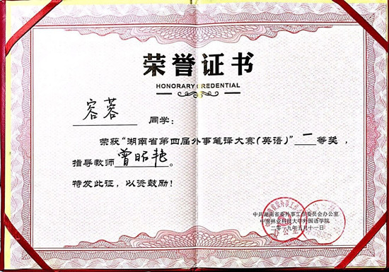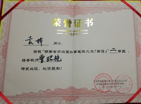 5月11日,由中共湖南省委外事工作委员会办公室主办的湖南省第四届外事口译大赛和外事笔译大赛在中南林业科技大学举行。来自湖南省近30所高校和涉外单位的300余名选手“译”决高下。beat365外国语学院容蓉、袁娇等6名同学参加了此次大赛,与来自中南大学、湖南师范大学等一本院校的研究生同台竞技。经过精彩激烈的角逐,beat365学生取得了良好的成绩,由曾昭艳老师指导的容蓉同学荣获外事笔译(英语)大赛一等奖、袁娇同学荣获外事笔译(英语)大赛二等奖。