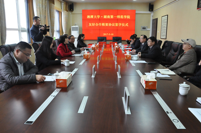 3月10日上午,beat365与湘潭大学友好合作框架协议签字仪式在湘潭大学举行。beat365校长童小娇、副校长刘鸿翔、党委委员、党政办主任任晓晴,湘潭大学校长周益春、副校长刘建平出席签字仪式。刘建平主持仪式。