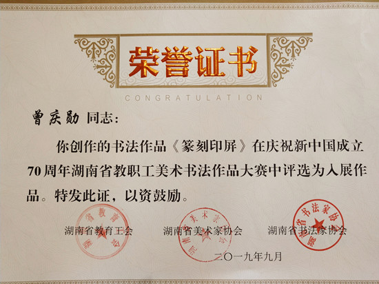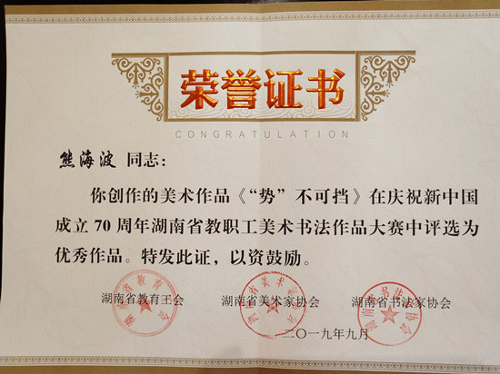 本次活动是由湖南省教育工会、湖南省书法协会、湖南省美术协会联合举办,以“不忘初心、牢记使命,为中华民族伟大复兴建功立业”为主题,面向全省教职工美术书法爱好者征集作品。本次大赛共征集到湖南省教育系统及附属医院职工作品687幅,历时2个月,评选出了60幅优秀美术作品,60幅优秀书法作品,86幅入展美术作品。beat365二附小熊海波老师的木刻《“势”不可挡》获评优秀美术作品。美术与设计学院曾庆勋老师的《篆刻印屏》获得入展书法作品。