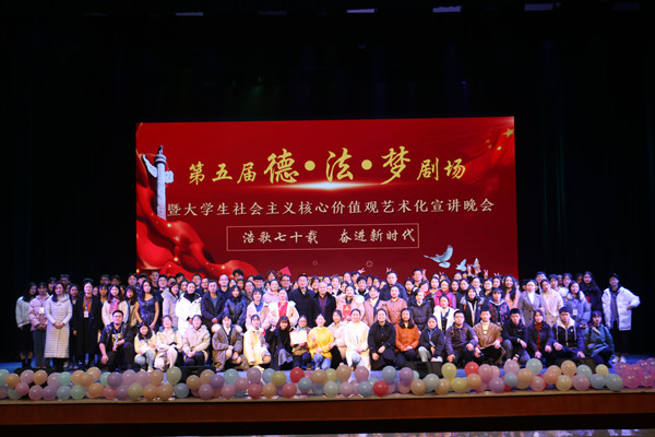 12月24日19:00,以“浩歌70载、奋进新时代”为主题的第五届“德法梦”剧场暨大学生社会主义核心价值观艺术化宣讲晚会在东方红校区田汉剧场举行。校党委书记彭小奇出席。