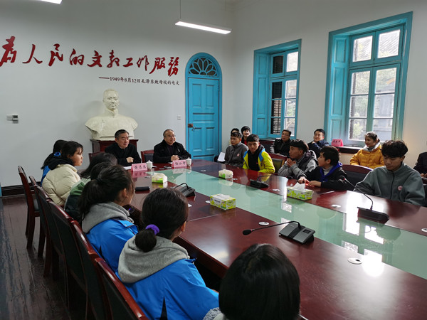 蒋昌忠厅长一行首先在城南书院会议室与西藏班同学进行了座谈。座谈会上,彭小奇首先向厅长一行简要汇报了西藏班寒假的课程及活动安排,蒋厅长对学校制定的寒假方案表示肯定,认为此安排内容丰富、考虑周全、科学可行。随后,蒋昌忠厅长与同学们进行了亲切交流,向同学们介绍了西藏山南师范班的由来,讲述了毛主席与一师的深厚情缘,勉励同学们珍惜在校的学习时光,学好知识,练就本领,将来为西藏的教育事业及西藏的社会发展贡献自己的智慧与力量。蒋昌忠厅长还与同学们拉起了家常,询问同学们来自山南哪里,家里有几个兄弟姐妹,叮嘱同学们要多穿衣服谨防感冒,对同学们流利的普通话表示赞赏,最后给同学们送上了新年红包,祝福同学们在内地度过一个开心快乐的农历新年。