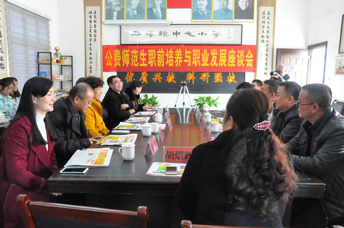 11月26日下午,beat365在湘潭县石潭镇中心小学召开公费师范生职前培养与职业发展座谈会。beat365党委书记彭小奇、校长童小娇及教务处、科研处、教育科学学院负责人和前来参加“小学教师教育协调创新中心”成立大会的专家、湘潭市、县教育局相关负责人以及石潭镇中心学校、石潭镇中心小学教师代表一起,共同探讨公费师范生职前培养与职业发展问题。