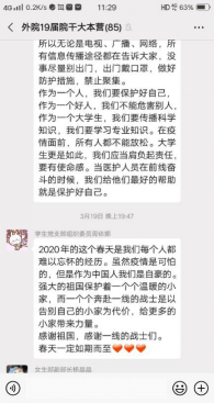 危机时刻正是教育的宝贵时机,外国语学院、体育学院党总支通过线上线下方式结合,引导青年学子听党话跟党走,在为人民服务中茁壮成长、在艰苦奋斗中砥砺意志品质、在实践中增长工作本领,彰显了党组织的战斗堡垒作用和党员的先锋模范作用。