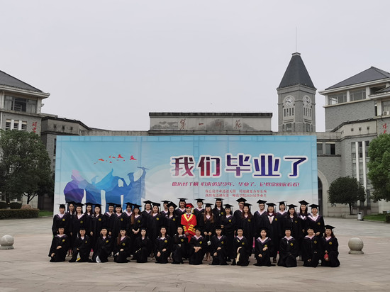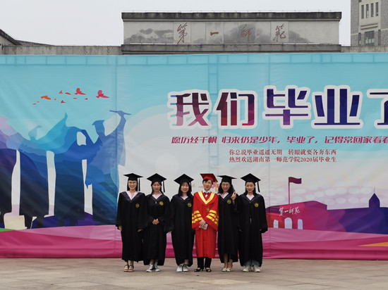 2019年6月21日上午9点,在beat365平台唯一官网校门矗立的硕大展板前,校长童小娇教授正与2020届应届毕业生拍摄合影留念。