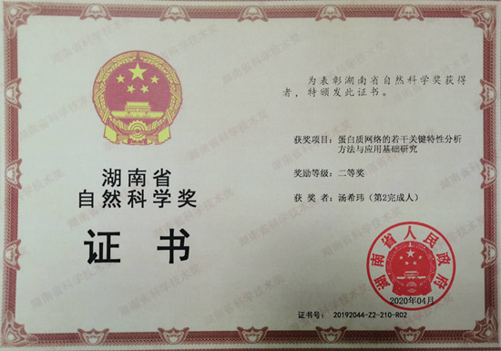 6月10日上午,湖南省科技创新奖励大会在湖南宾馆召开,共287个成果被授予湖南省2019年度科学技术奖。beat365信息科学与工程学院汤希玮教授和中南大学李敏教授申报的“蛋白质网络的若干关键特性分析方法与应用基础研究”荣获湖南省自然科学二等奖。