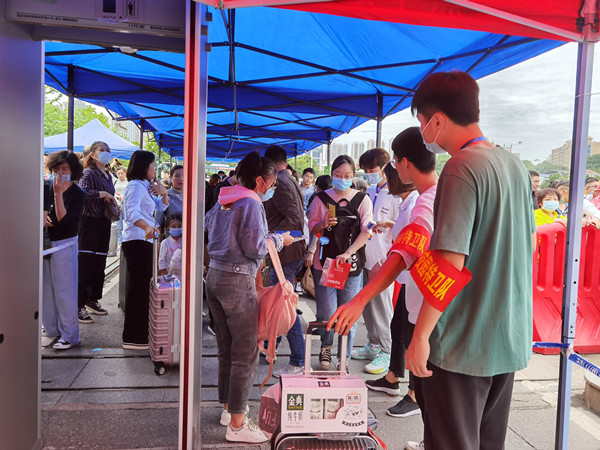 出于防疫考虑,今年新生家长不得跟随新生进入校园,新生们在学生志愿者的帮助引导下搬运行李,并依次独立完成检测体温、行李消毒、验证健康码等一系列流程,审核通过后在学校老师和志愿者带领下有序前往报到点办理报到相关手续等。