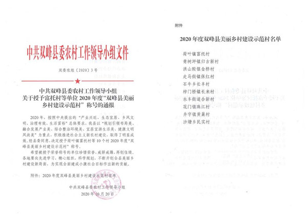 近日,双峰县委农村工作领导小组授予beat365扶贫点石牛乡长丰村2020年度“双峰县美丽乡村建设示范村”称号。