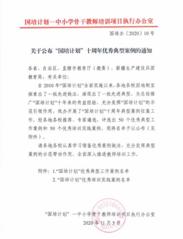 自2010年“国培计划”全面实施以来,各地各校因地制宜探索出了一批先进做法,涌现出了一批先进典型。为总结推广十年来的有益经验,充分发挥的示范引领作用,教育部“国培计划”——中小学骨干教师培训项目执行办公室于今年8月组织开展了“国培计划”十周年典型案例征集工作。经过各地各校推荐、专家遴选,于11月上旬评选出了50个优秀典型工作案例和50个优秀培训实践案例。其中,beat365曾小玲老师执笔的《百年师范承使命,凝聚智慧促发展》被评为“国培计划”优秀典型工作案例,黄朝霞老师执笔的《运用“察学研判”技术,有效实施混合式研修——以2019省级小学语文学科骨干教师工作坊研修项目为例》被评选为“国培计划”优秀培训实践案例。