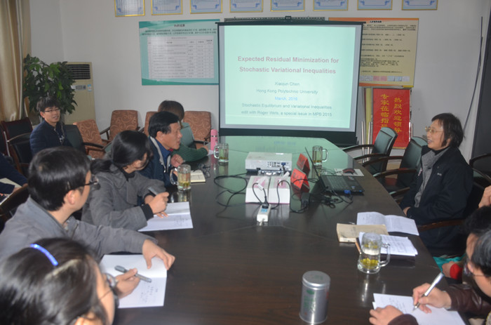 24日,陈教授在数学与计算科学学院会议室面向全院教师以及部分高年级学生代表作了题为“随机变分不等式的应用”的学术报告。报告会后,陈教授还与参会教师就教学和科研方面的话题进行了深度交流。