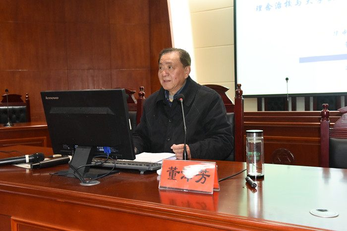 董教授首先从问题“一所大学怎么办学,怎么治校,怎样实现持续发展?”入手,引出话题“理念治校与学校发展的关系”。从教育理念的内涵及先进教育理念的特征、“理念治校”大学发展面临的新课题、先进教育理念在现代学校发展中的重要作用、先进理念形成的主要途径、自己对教育理念的思考与追求五个方面进行了深入浅出的阐述和讲解,运用了国内外知名高校的大量实际例证充分诠释了自己的观点理论。着重分享了自己曾作为高校主要负责人的治校理念:以生为本、以爱为基、以学为尊、以法为序、以变应变、以和为贵。他强调指出:以生为本,是大学办学的第一理念;以爱为基,是大学应有的人文关怀;以学为尊,是大学永恒的价值取向;以法为序,是大学治校的基本方略;以变应变,是大学发展的动力源泉;以和为贵,是大学文化发展的品质。每个问题,董教授均从概念内涵、意义分析、实施方略三个方面做了详尽阐述。