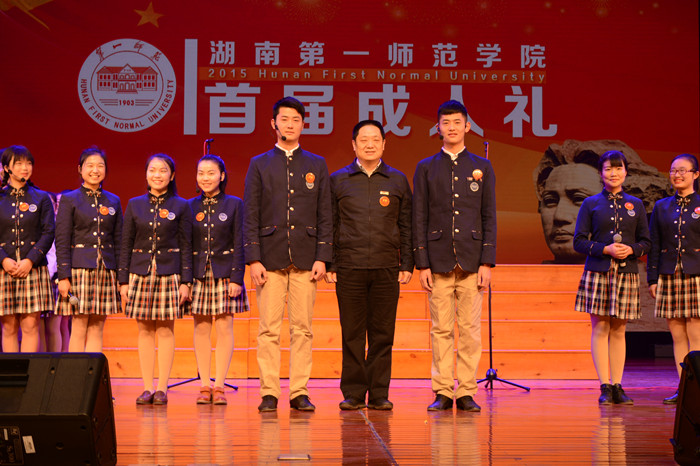 彭小奇书记、肖湘愚校长为18名青年代表颁赠了成人礼纪念徽章并合影留念。