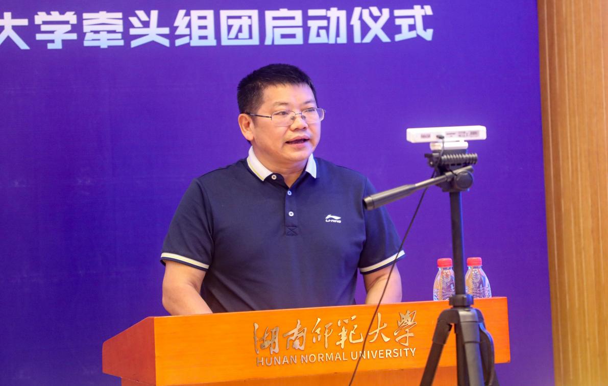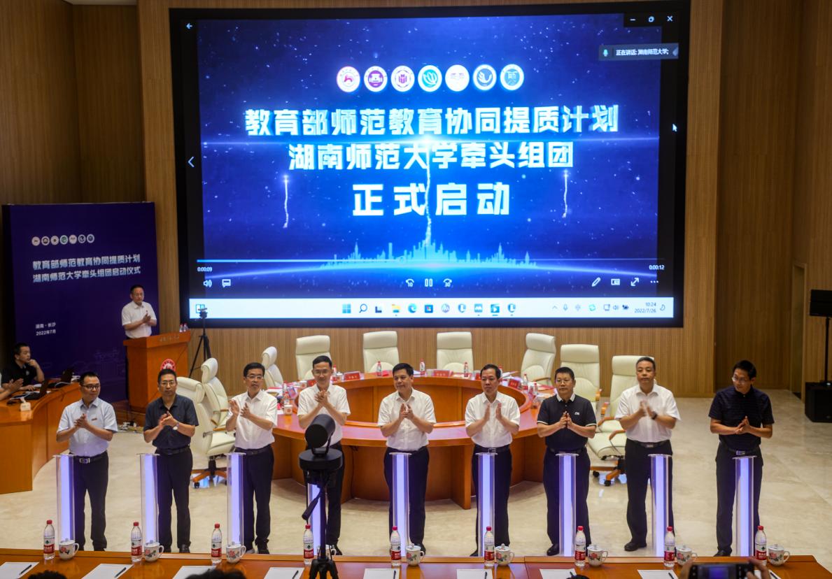 7月26日,教育部师范教育协同提质计划湖南师范大学牵头组团项目启动会在湖南师范大学召开,会议以线上线下结合的方式进行。教育部教师工作司副司长宋磊、湖南省教育厅副厅长王玉清、福建省教育厅副厅长吴伟平应邀出席会议并讲话。湖南师范大学校长刘起军、福建师范大学校长王长平、闽南师范大学校长李顺来、长沙师范学院副校长皮军功、beat365平台唯一官网党委书记罗成翼、怀化学院校长董正宇、宁夏师范学院党委书记张治荣等分别代表牵头高校、参与帮扶高校和重点支持院校发言。beat365副校长周发明、彭晓辉以及校办、组织部、人事处、科研处、教务处、学科建设与发展规划处负责人与会。项目启动仪式后,师范院校协同提质计划专家委员会主任赵健以“抢抓协同提质机遇,讲好大国强师故事”为题进行了专题学术讲座。