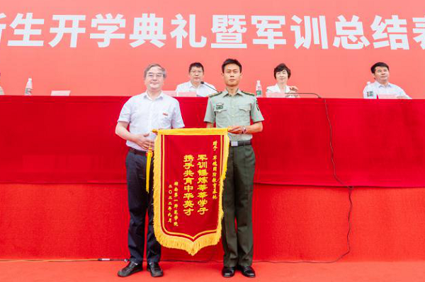总结表彰大会上分别宣读了两个校区的新生军训优秀标兵和优秀教官、内务评比优秀寝室和分列式优秀方阵名单,全体领导向受到表彰的集体和个人颁发了锦旗和获奖证书。副校长曹兴代表学校向湖南省军魂国防教育基地赠送了锦旗。