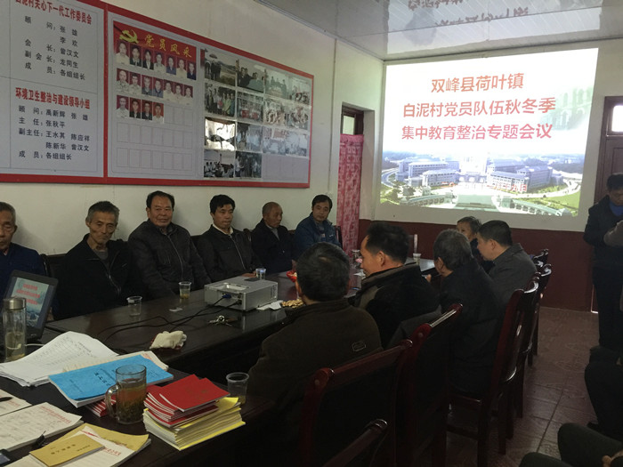 活动,对所有党员特别是流动党员进行重新梳理登记,建好党员管理台账,重新清理党员档案;采取多种方式,组织党员100%参加集中培训,重温入党誓词,围绕主题讲党课;召开高质量的组织生活会,民主评议党员,严格按照《娄底市不合格党员处置办法》,对违反党纪党规的党员一律处置,切实纯洁党员队伍。会议强调,整治行动既是推进全面从严治党的必然要求,也是推进县委、镇党委基层组织创建活动的重要举措,更是解决党员队伍建设突出问题的现实需要,全村党员务必深刻认识搞好集中教育整治的重要意义,动真格,出实招,敢碰硬,确保集中教育整治行动取得实实在在的效果。会上,扶贫工作队还向与会党员通报了白泥村三年扶贫整体规划、项目资金使用情况以及项目实施进度等情况。