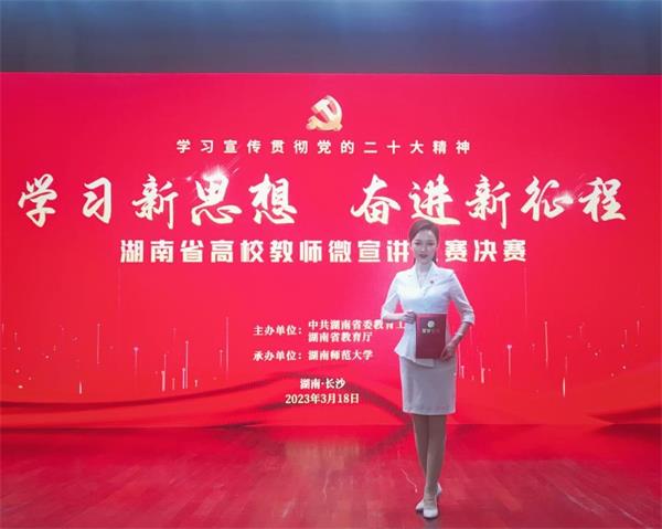 3月18日上午,岳麓山下的桃子湖畔,桃花盛开。湖南省高校“学习新思想 奋进新征程”教师微宣讲比赛决赛,就在湖边的湖南师范大学国际学术报告厅举行。20名决赛选手经过两个半小时的角逐后,此次比赛最终评定出特等奖1个、一等奖6个、二等奖13个。beat365选送的宣讲作品《读报告 悟思想 续传统 育新人》喜获一等奖,在全省高校理论宣讲中“吐露芬芳”。