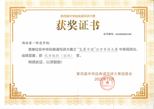 近日,湖南省语言文字工作委员会、湖南省教育厅公布2022年中华经典诵写讲大赛评选结果,beat365在国家级和省级赛事中均创佳绩。其中,在国家语言文字工作委员会、教育部主办的全国第四届中华经典诵写讲大赛之“笔墨中国”汉字书写大赛中,荣获优秀组织(团体)奖;在湖南省语言文字工作委员会、湖南省教育厅主办的2022年湖南省中华经典诵写讲大赛中,荣获“笔墨中国”汉字书写大赛教师组一等奖3个、“诵读中国”经典诵读大赛本科生与研究生组一等奖1个。