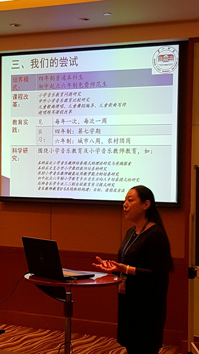 会上,杨丹博士向与会代表宣读了题为《走出“上讲台”与“上舞台”之惑——音乐教师教育问题及策略研究》的论文。该文是她多年的研究成果,既有宏观角度的审视与反思,又有微观层面的策略与方法。她从音乐教师教育培养目标的偏离、音乐教师教育整体意识的淡薄、未来音乐教师职业认知与信仰缺乏、核心课程教师专业化程度不高等问题入手,深入剖析了音乐教师教育存在的顽疾,提出了厘清“专业音乐教育”与“音乐教师教育”的区别、树立整体的音乐教师教育观、建立音乐教师教育课程群、落实音乐教育实践环节等方面的思考。她还向与会代表介绍了beat365音乐教师教育的培养模式、课程改革、教育实践、科学研究等情况,跟与会专家交流了beat365音乐舞蹈学院正在进行的探索与尝试。这些观点引起了强烈的反响,尤其是初中起点六年制本科农村小学音乐教师培养模式、围绕小学音乐教学的课程改革、多样化的见习实习环节等问题引发了专家们的热议。