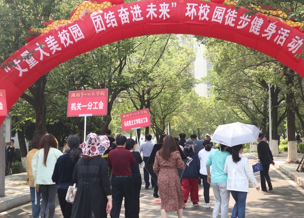 梅子黄时雨又晴,春衫未脱暑犹轻。5月12日下午,由校工会组织的“丈量大美校园,团结奋进未来”教职工徒步走活动分别在东方红校区和城南校区举行。学校党委书记罗成翼,党委副书记、校工会主席李克勤,副校长曹兴、周发明,纪委书记李昱,副校长江正云、蒋蓉,与全校1200余名教职工一起参加了此次徒步健身活动。