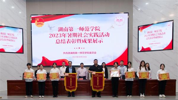蒋蓉宣读了2023年暑期社会实践活动先进集体和个人名单。领导、嘉宾为获奖团队和个人颁发证书、锦旗及奖金。