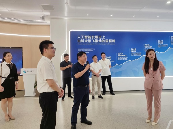 在科大讯飞人工智能展厅,罗成翼一行听取了科大讯飞的发展历程以及AI+系列核心技术应用情况。在校企交流座谈会上,王金生介绍了科大讯飞的核心业务板块、与其他高校开展校企合作的情况,表示校企双方可以围绕人工智能领域在智慧教学、智慧管理服务、人才培养模式创新等多个方向开展更深层次合作。