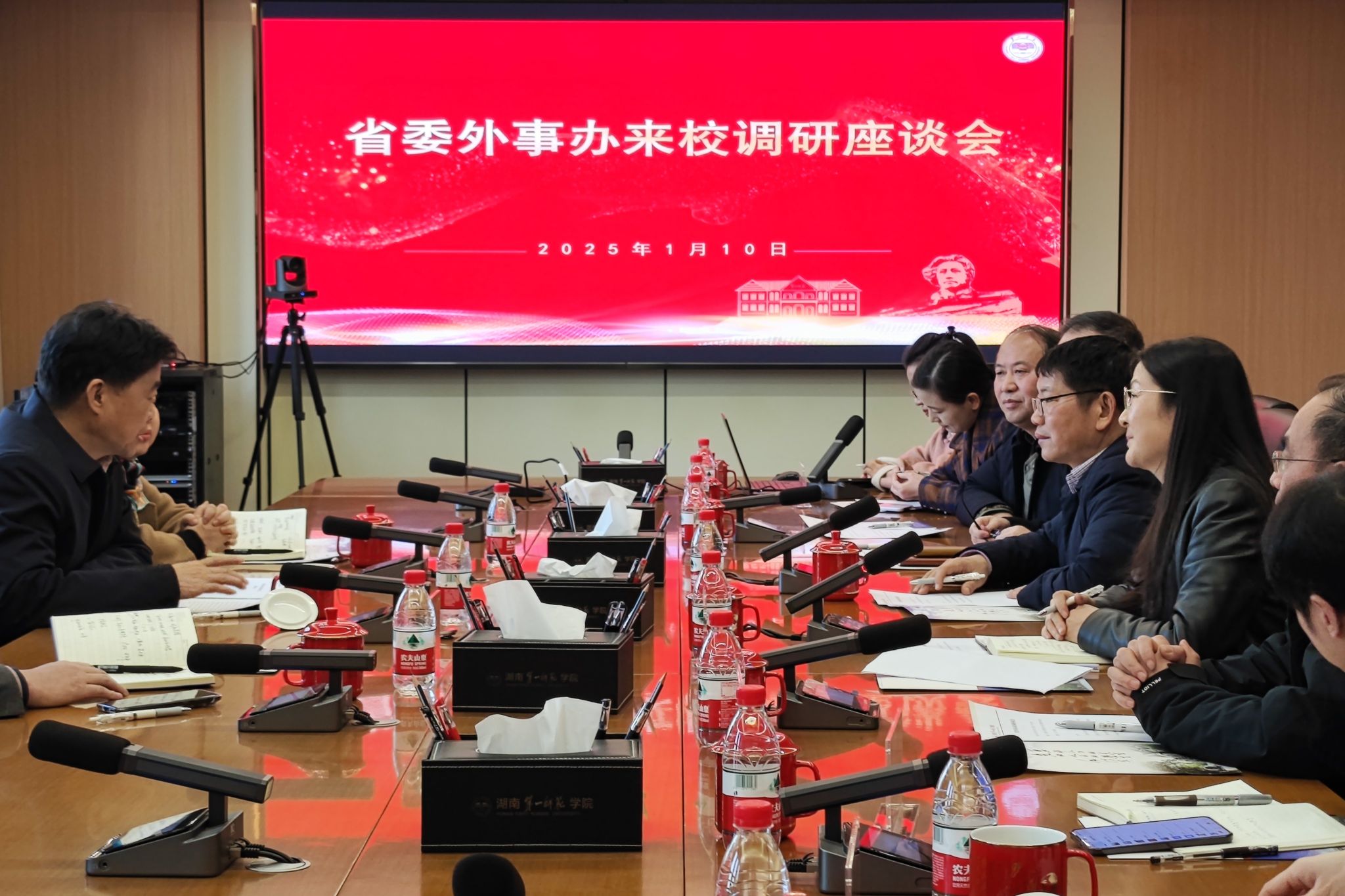 1月10日下午,中共湖南省委外事办一级巡视员邱爱华一行莅临beat365,就书院文化传播工作开展调研。调研座谈会在百熙楼710会议室召开。校党委书记罗成翼,校党委委员、副校长蒋蓉出席会议。外国语学院、文学与新闻传播学院、音乐舞蹈学院、美术与设计学院、初等教育学院等相关部门负责人参加会议。会议由蒋蓉主持。