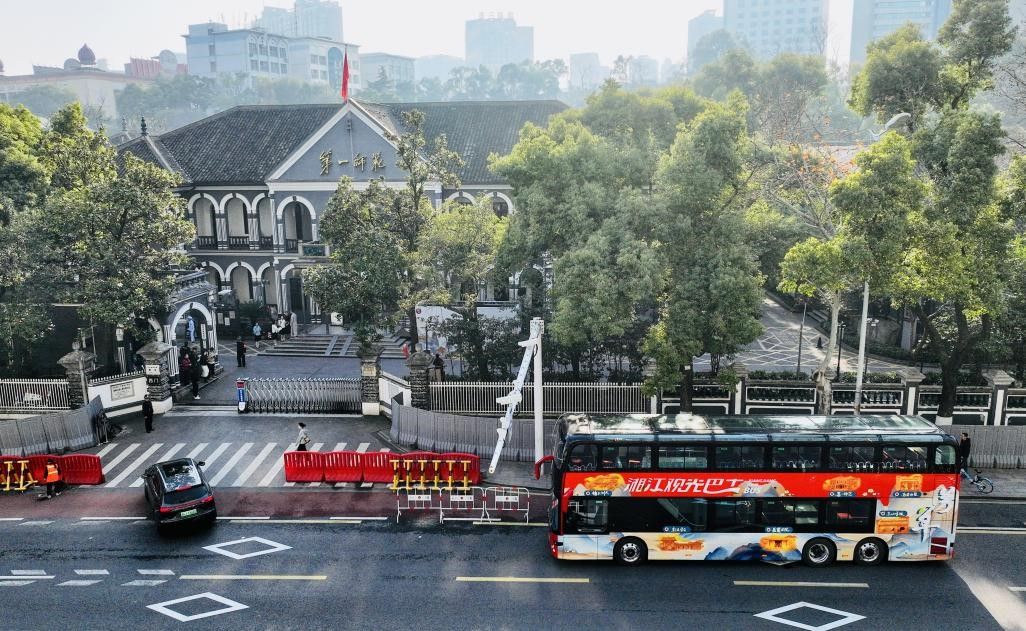 师生代表乘坐“芳草巴士”体验“伟人成长成才”精品研学线路(路线:湖南第一师范旧址→橘子洲头青年毛泽东雕塑广场→新民学会旧址→岳麓书院→湖南第一师范旧址)
