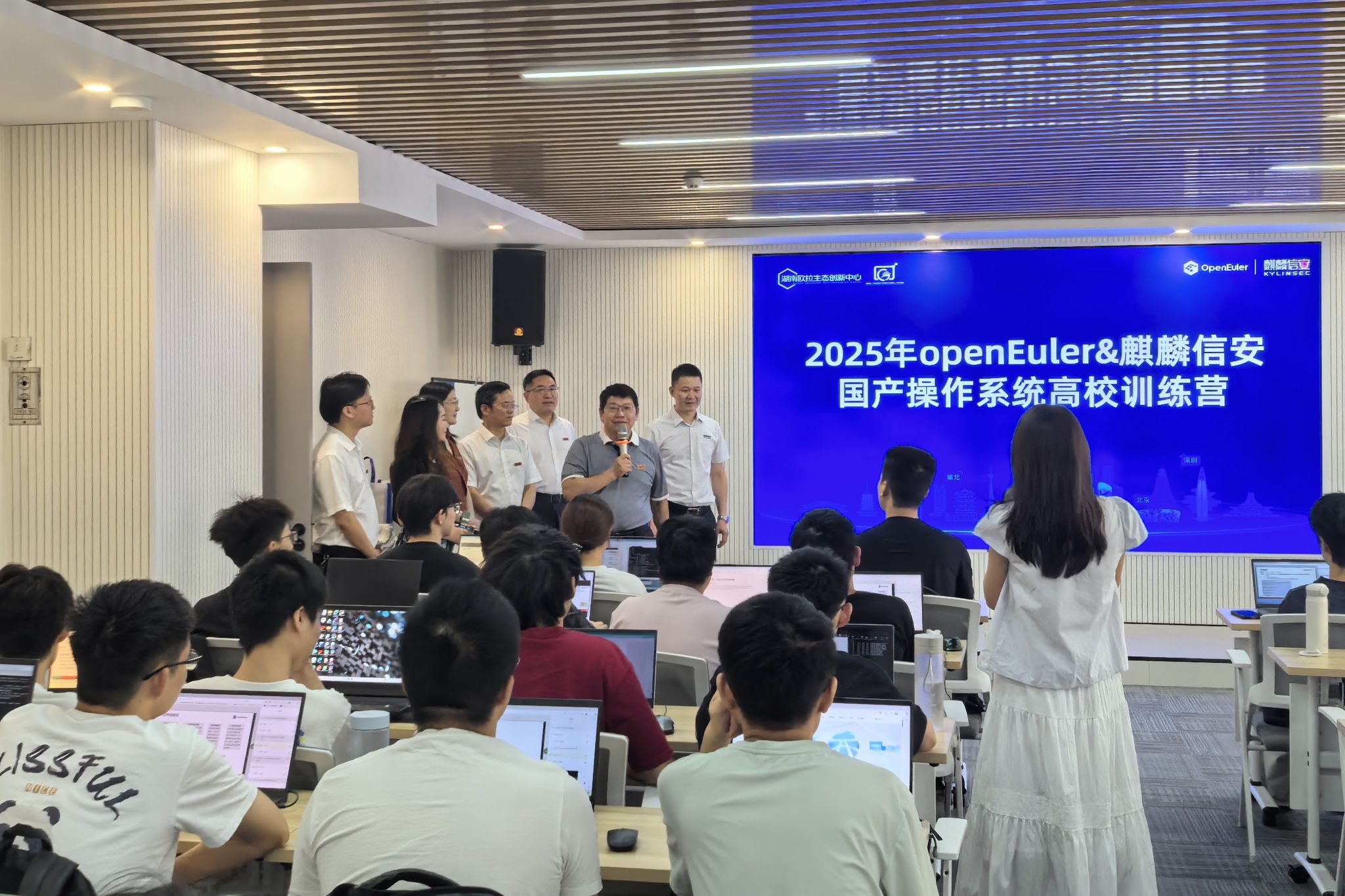 上午,罗成翼一行来到计算机学院“双百行”实践团队实习基地湖南麒麟信安科技股份有限公司,深入实习现场与师生交流,调研openEuler产教融合工作。麒麟信安高级副总裁王攀陪同参观欧拉展厅,介绍国产操作系统创新成果及openEuler系列产品应用情况。