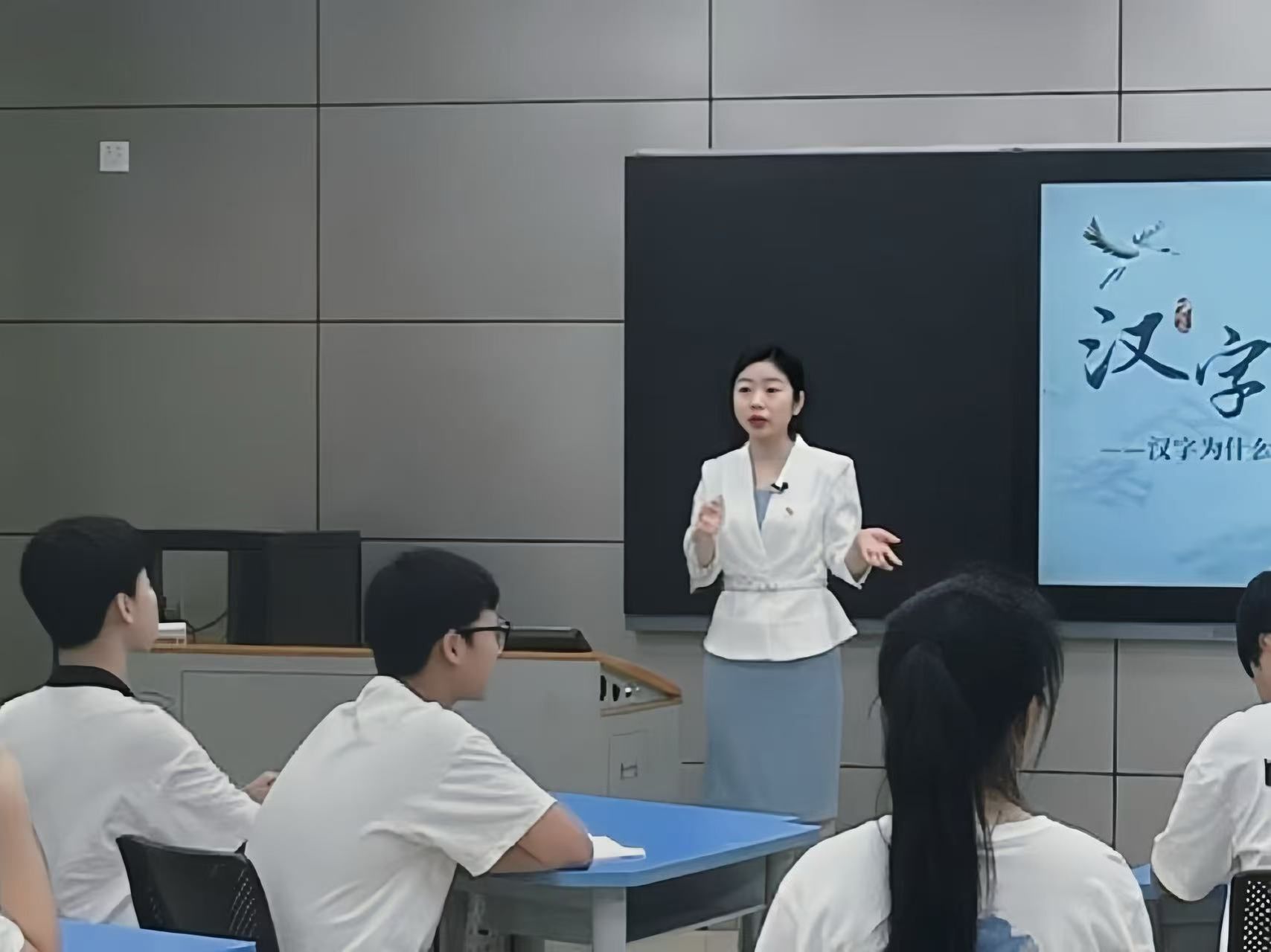 赵姣老师的课堂上,凸显实践特色、学科交叉特色的生动案例同样让学生印象深刻:如讲述“推普”“三下乡”等实践故事,将国家语言政策与职业情怀教育融为一体;引导学生辩证分析网络新词等语言现象,培养批判性思维与“取其精华”的鉴别力;通过公安刑侦语音识别等前沿案例,激活“语言学+”交叉思维;深挖汉语魅力与“汉语热”现象,树立学生的汉语自信与家国情怀。