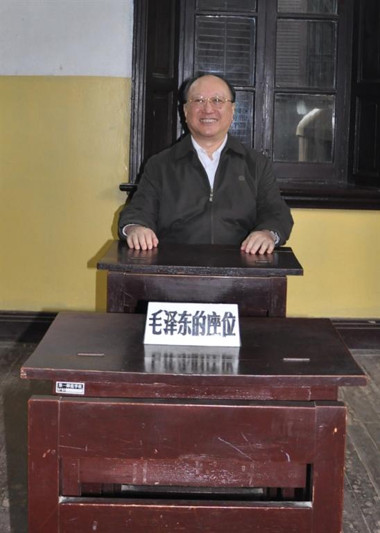 在毛泽东当年求学的八班教室,大家请徐院士坐在毛泽东曾坐过的座位上留影纪念。院士却坐在主席座位的后一个座位上笑着说:“我是毛泽东的学生,坐在主席的后面照张相。”他还说,这座位设计不错,座凳左侧前后相连固定,促使学生上课身体保持端正,这很科学。