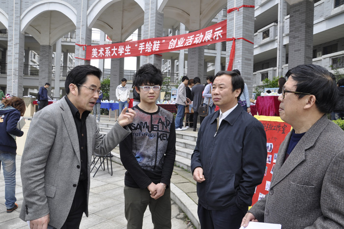 今天,他们将自己“手绘鞋”创业活动的图片、成果向全院师生进行展示,以激发同学们的创业热情,弘扬创业文化,引导和鼓励大学生自主创业,在学院内营造浓厚的自主创业氛围。副院长刘志敏、纪委书记阳柏苏及教务处、学生处的相关领导参加了展示活动的开幕式。刘院长、阳书记饶有兴趣地了解了汪鹏辉他们的创业经历,并鼓励大学生学习他们这种创业精神,另辟蹊径,大胆创业。