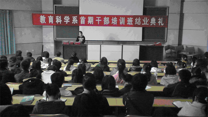 3月11日中午,我院教育科学系首期干部培训班结业典礼在理科楼报告厅隆重举行。教科系党支部副书记袁向荣、专职辅导员刘军、董晓雅、蒋洁、陶青以及130名学生干部出席结业典礼。结业典礼由教科系学工办主任、学生党支部书记阳丽主持。