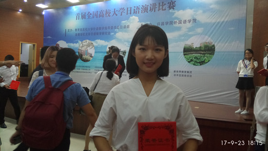 9月22日-23日,首届全国高校大学日语演讲比赛在河南许昌学院举行。beat365外国语学院2014级翻译7班范家慧同学荣获大赛二等奖,这是beat365学子首次在小语种全国演讲大赛中获奖。