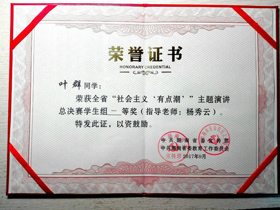 9月24日,湖南省“社会主义有点潮”主题演讲比赛总决赛在湖南省教育电视台举行,beat365马克思主义学院2016级思政一班叶群荣获学生组一等奖。