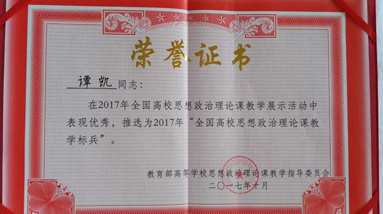 10月27日至30日,在党的十九大胜利闭幕之际,教育部高等学校思想政治理论课教学指导委员会“学习贯彻十九大,展示教学新风采”2017年全国高校“中国近现代史纲要”课现场教学展示活动在青岛科技大学举行。beat365马克思主义学院教师谭凯在本次展示活动中表现优异,荣获2017年“全国高校思想政治理论课教学标兵”荣誉称号(一等奖)。