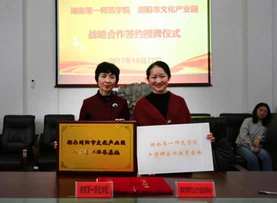 随后,美术与设计学院院长范迎春和浏阳市文化产业园企业长沙海茗玥文化创意有限公司总经理杨明签订《校企产学研合作协议书》,并就校企实质性的合作进行了详细研讨。
