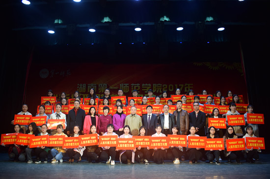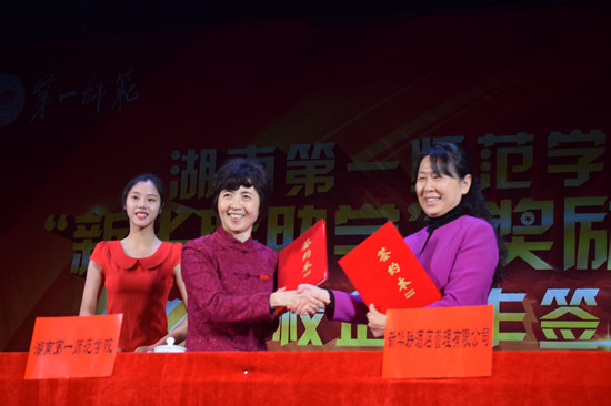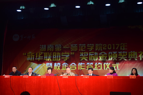 刘宇宣布了《关于表彰2017年度“新华联助学”奖励金获得者的决定》。新华联集团嘉宾及学校领导为获得2017年度“湖南一师·新华联助学”奖励金的同学颁发了奖金和证书。获得“新华联助学”奖励金的学生代表、商学院2015级旅游管理二班陈佳兴同学作了发言。