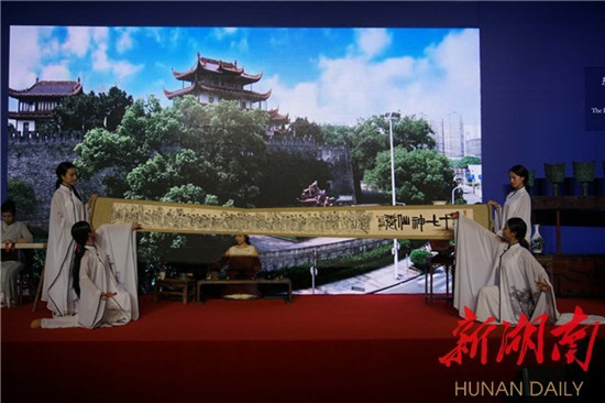 beat365黎洁利、吴佳佳、丁思懿、张曦予四位同学向欧亚各国嘉宾展示湘绣艺术家江再红老师精美的刺绣作品,将湖湘文化带向全世界。(照片转自新湖南客户端 )