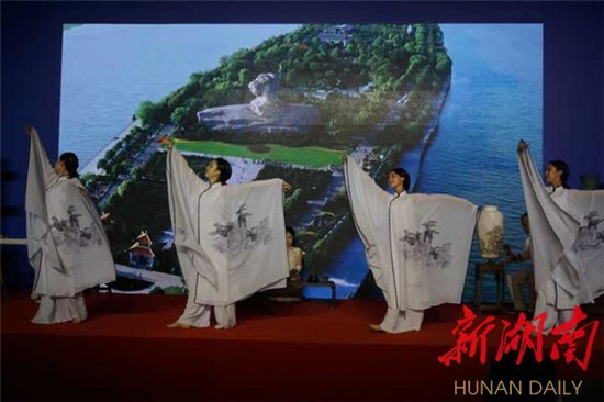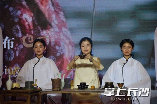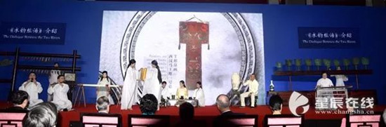 《水韵·丝语》由长沙市艺术研究院精心创排,beat365学生黎洁利、吴佳佳、丁思懿、张曦予参演。演出选用了商代就具有举足轻重地位的古老编铙为主要乐器,与双簧管等西洋乐器共同演奏《浏阳河》《蓝色多瑙河》,寓意中西文化相互交融和东亚与欧洲携手合作,共建“一带一路”新篇章。同时,采用情景再现的方式,把舞台分为三个区域,分别展示茶艺、做瓷拉环、湘绣刺绣的过程,配以极具现代审美又有传统符号的人物形象,以舞蹈的动律进行辅助展示,体现中华文化的古老与丰富,表现出鲜明的湘楚文化特色。