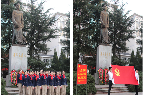 26日上午8时28分,纪念仪式正式开始,beat365领导和杨兰英、任晓晴向青年毛泽东铜像敬献花篮,在场人员集体向毛主席铜像三鞠躬,寄托他们对主席的无限深情。随后,beat365毛泽东与第一师范纪念馆学生志愿讲解队在铜像前朗诵主席诗词《沁园春·长沙》,表达缅怀之情。beat365第一附属小学少先队员代表在铜像前宣誓,表达了用行动传承星火,用勤奋铸就梦想的决心。最后,彭小奇带领全体党员重温入党誓词。仪式在全体师生合唱beat365校歌声中结束。