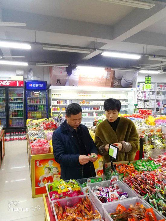 在门店,检查人员认真查看食品的生产日期,要求门店主不能销售三无食品,文明经商。