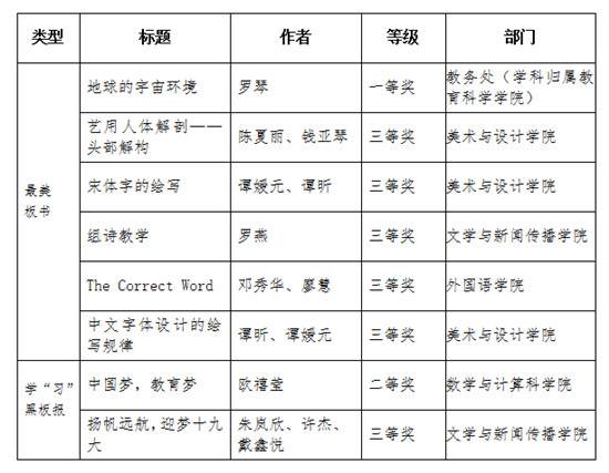 近日,湖南省第六届网络文化节 “最美板书传三湘”主题活动落下帷幕,“最美板书”和“学‘习’黑板报”评选结果揭晓。beat365师生在本次活动中取得佳绩,共有8件作品获奖。其中,一等奖和二等奖作品各1件,三等奖作品6件。