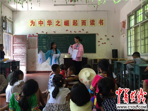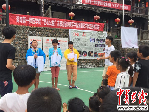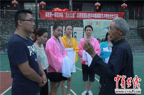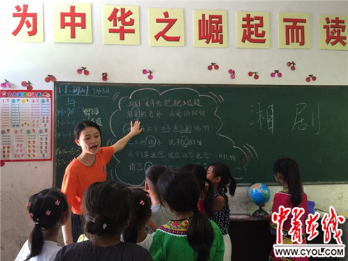 在湖南省湘西自治州永顺县老司城村的一所小学里,初来乍到的大学生一放下行李,就布置出来一个湘剧文化艺术广场:民族乐器秀、戏曲脸谱秀、湘剧服装秀、湘剧身段秀等一一亮相,让孩子们惊喜不已。随后,陆续安排的湘剧体验活动,让小朋友们可以穿湘剧服装、练习湘剧身段,欣赏《描容上路》、《赠剑》等湘剧片段,年纪大一点在跟着大学生用湘剧高腔唱《学习雷锋好榜样》和湘剧现代戏《月亮粑粑》,可谓是扎扎实实地过了一把湘剧“瘾”。